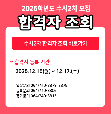 2025학년도 동계 계절학기 안내 - 추가 수강신청기간 : 2025.12.12(금) ~ 2025.12.15(월) 오후 5시까지※ 수강신청을 희망하는 학생은 지도교수 및 학과장의 지도를 받은 후 교무학생처(064-740-8817)로 연락바랍니다.- 수업기간 : 2026.01.05(월) ~ 2026.01.23(금), 15일간 매일 수업 진행※ 개설과목 현황 및 기타 자세한 내용은 첨부파일을 참고바라며, 수강신청 방법은 정규학기와 동일함- 수강료 : 학점당 80,000원 / (예시) 2학점 × 80,000원 = 160,000원- 수강료 납부기간 : 2025.12.15(월) ~ 2025.12.19(금)※ 수강료 미납 시 수강포기로 간주하여 삭제처리하며, 수강료는 반드시 학생 본인의 이름으로 입금하여야 함- 수업문의 : 교무학생처 수업 담당 / 064-740-8817 / 평일 오후 4시 50분까지- 수강료 납부/환불 문의 : 행정지원처 등록 담당 / 064-740-8806 / 평일 오후 4시 50분까지- FAX : 064-748-2829